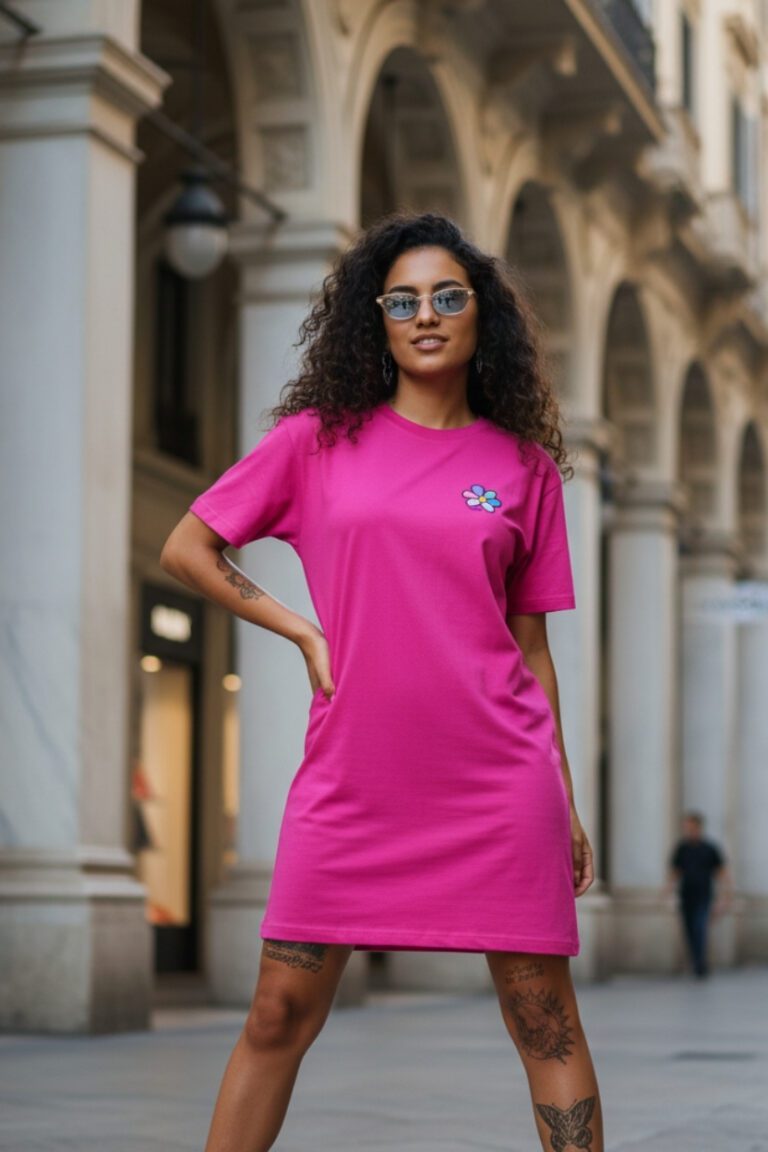 Vestito corto in tessuto leggero di puro cotone con maniche corte e scollo rotondo, con il logo stampato colorato sul lato cuore e sul retro.
